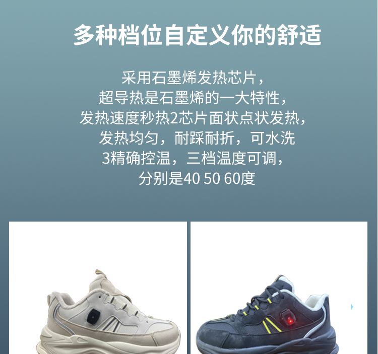 鞋子鞋墊發(fā)熱片具備良好的導電導熱性能,均勻發(fā)熱,遠紅外發(fā)熱能夠促進微循環(huán),對人體有益并達到理療效果。歸壹是石墨烯發(fā)熱技術方案解決商。采用安全低壓的設計理念,產品電壓遠低于人體36V安全電壓,更安全,理放心,便攜式充電寶即可有效充電。輕薄柔軟,手感極佳,且加熱性能優(yōu)良,任意折疊,穿帶用品不二選擇。