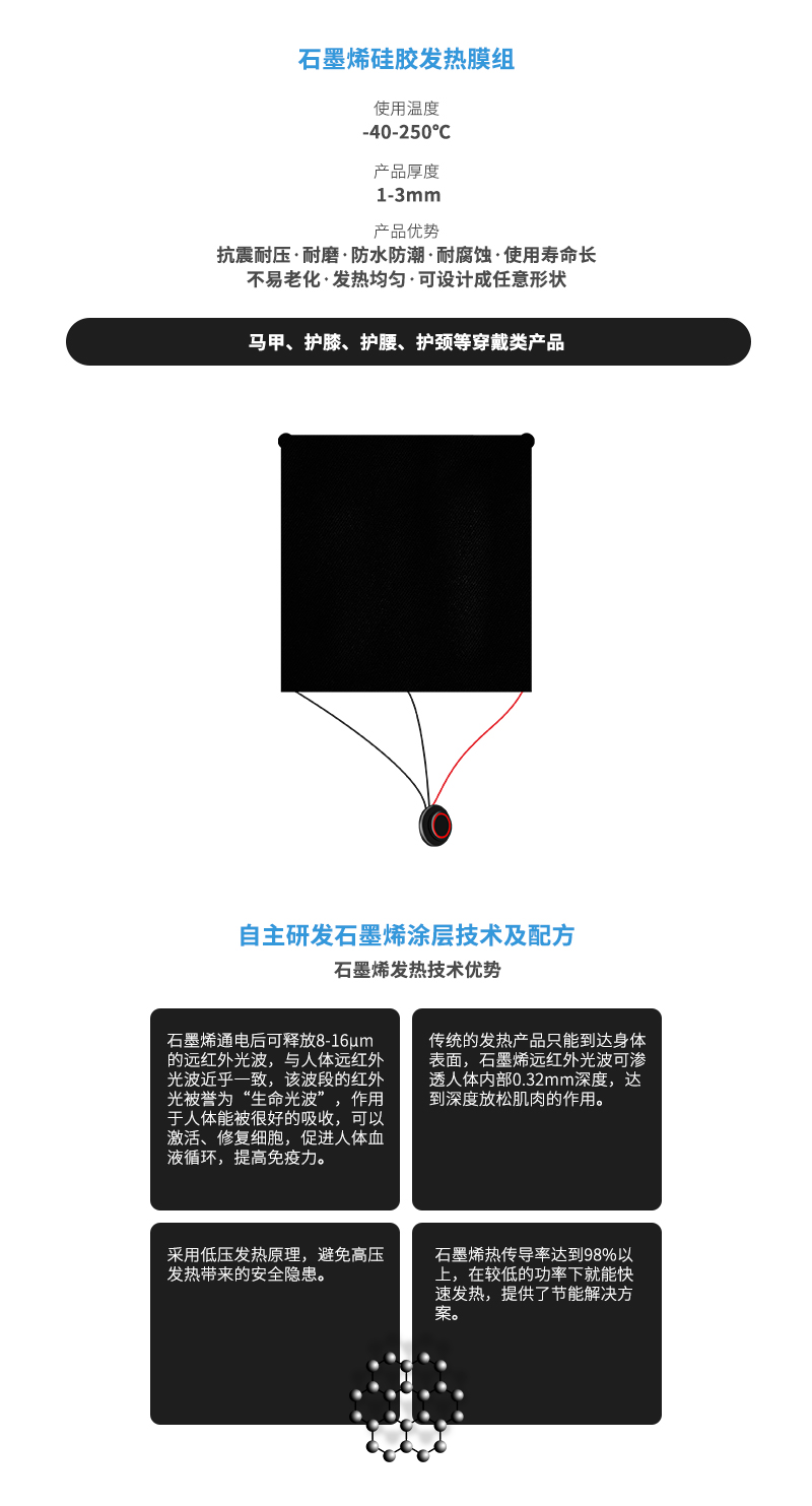 石墨烯硅膠發熱片泊狀、絲狀的金屬發熱體均布于涂布有耐高溫硅橡膠的玻璃纖維布間,經高溫模壓而成,被譽為最柔軟的發熱材料,可以與被加熱物體完全緊密接觸。因它具有柔性,更容易貼近加熱體,且形狀可隨物體形狀變化,具有發熱面大、發熱均勻、耐腐蝕、環保、阻燃、安裝方便、壽命長、絕緣強度高等特性,可以用于大面積、外露環境中使用。