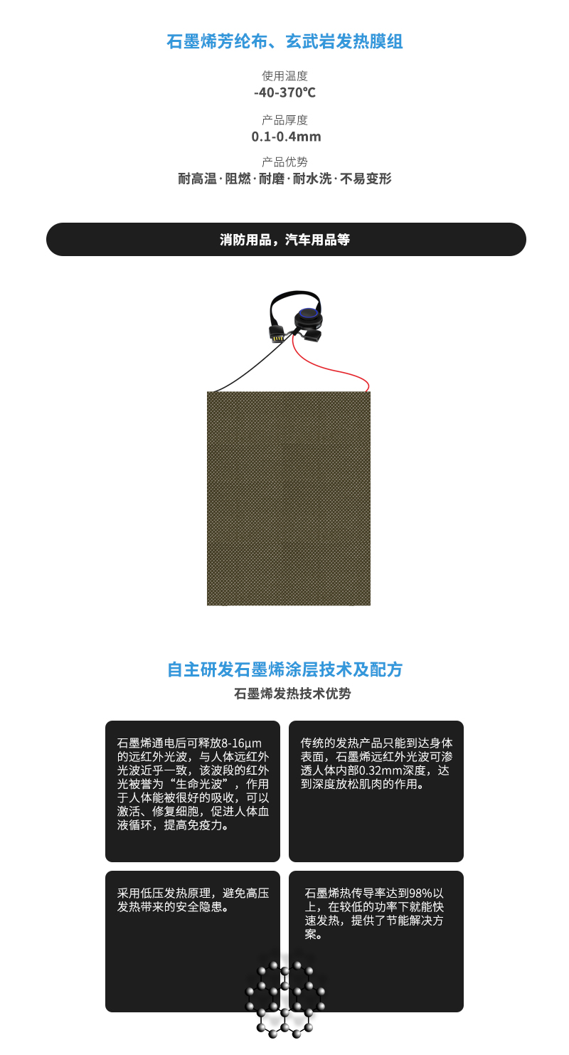 芳綸是一種新型高科技合成纖維,重量輕,屬難燃纖維,具有自熄性,在空氣中不易燃燒,具有高強(qiáng)度、耐高溫、耐熱、絕緣性、抗老化性等優(yōu)良性能,耐撕裂、耐摩擦,具有很長(zhǎng)的生命周期。耐高溫芳綸布石墨烯發(fā)熱模組防水防潮性好,適用于新型穿戴產(chǎn)品,如智能防護(hù)服、加熱馬甲等。